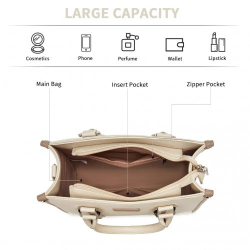 HBM2462 - Miss Lulu PU Leather Graceful Spacious Tote Bag with Woven Trim and Detachable Ethnic Strap - Beige