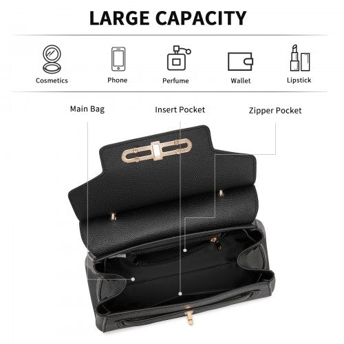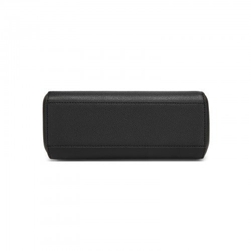 HBM2511 - Miss Lulu Elegant Structured PU Top-Handle Mini Satchel–Twist-Lock Flap and Detachable Handle - Black