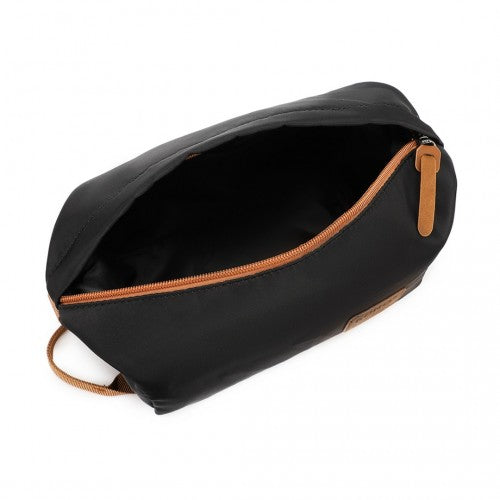 The versatile bag features an expandable design with a bottom zipper that increases its capacity. It offers a large main compartment, a separate wet/dry area, and dedicated pockets for small essentials. A back pocket provides quick access to personal items, while a nylon strap allows for easy attachment to luggage handles. A complementary clutch for toiletries adds to its travel-ready convenience, and a wide shoulder strap ensures comfortable carrying.